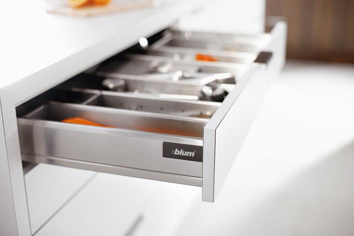 Szuflady są niezwykle ważnym elementem mebli kuchennych. Odpowiednio zastosowane, diametralnie poprawią funkcjonalność i ergonomię każdej kuchni. W naszych meblach stosujemy niezawodne i wszechstronne szuflady firmy Blum, z pełnym wysuwem i systemem cichego domykania.